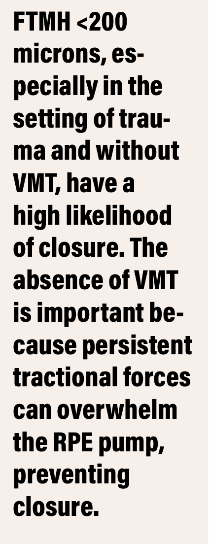 These studies highlight the anatomical characteristics that are important when considering which FTMH are more likely to spontaneously close. First, FTMH <200 µm, especially in the setting of trauma and without the presence of VMT, have a high likelihood of closure.8 In addition, the absence of VMT is important because persistent tractional forces can overwhelm the RPE pump, preventing hole closure.
