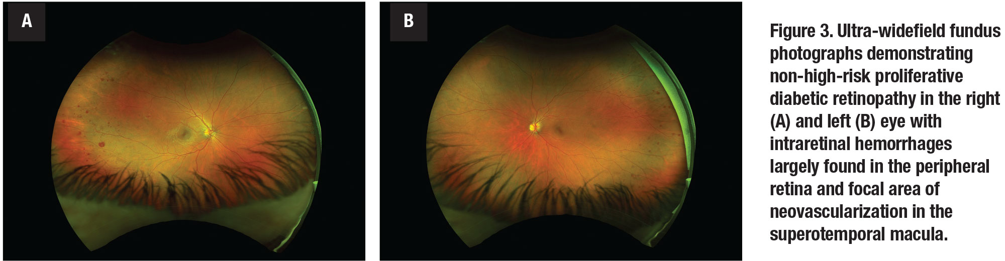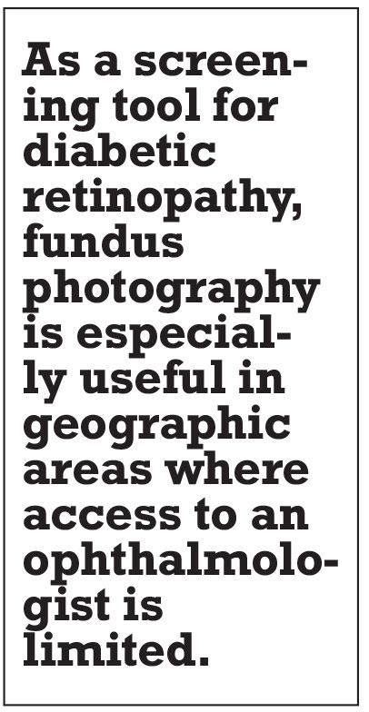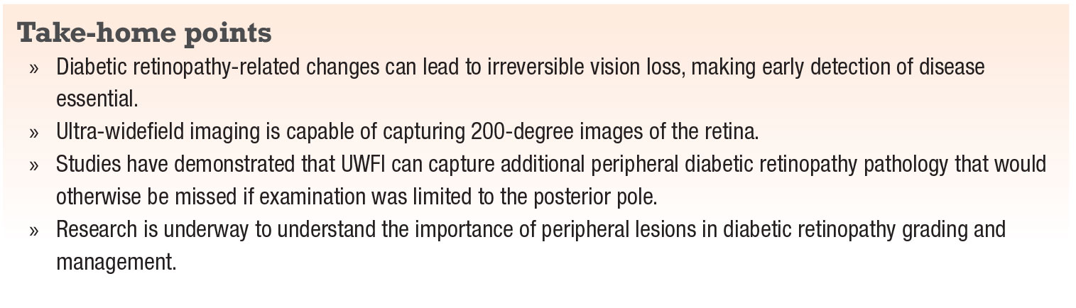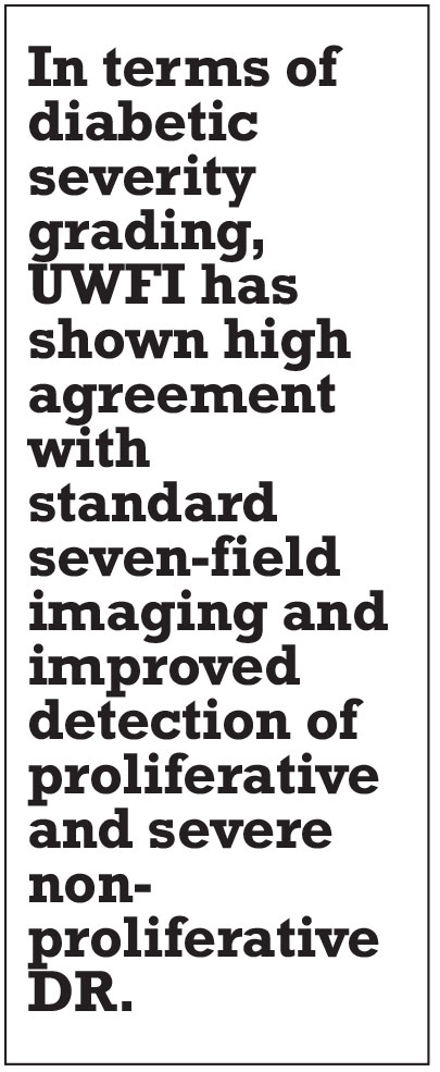 As a screening tool for DR, fundus photography is especially useful in geographic areas where access to an ophthalmologist is limited. A large study comparing nonmydriatic fundus photos to nonmydriatic UWFI showed that UWFI reduced the number of ungradable eyes by 81 percent, increased the identification of DR by nearly twofold and identified peripheral lesions suggesting more severe DR in approximately 10 percent of patients.15 These findings suggest that UWFI is a convenient and practical tool that can provide high-quality images for reliable diabetic retinopathy screening.