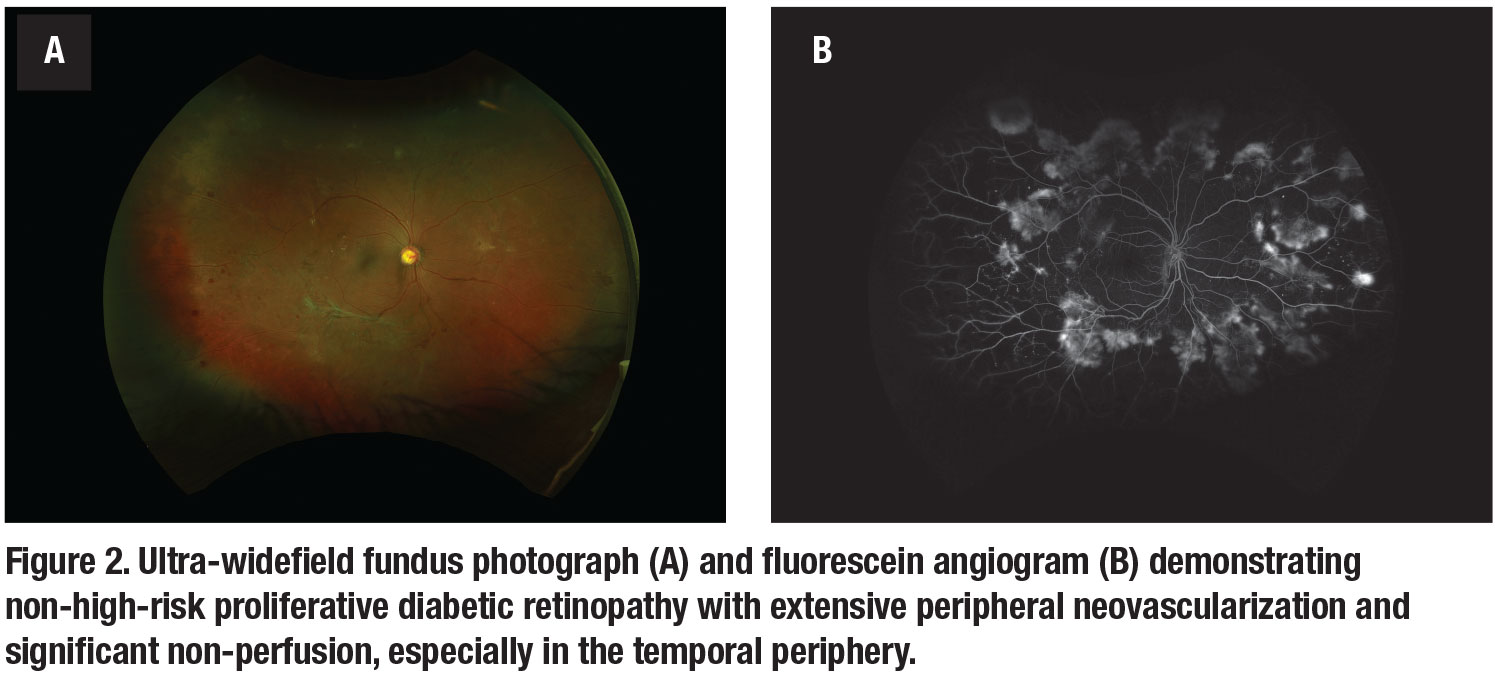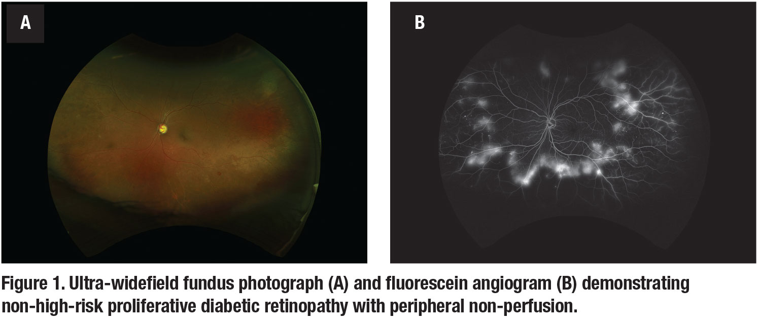 Reports of the association between peripheral non-perfusion and DME are conflicting. Some studies have reported a significant correlation between DME and peripheral retinal ischemia on UWFI. Matthew Wessel, MD, and colleagues found that eyes with retinal ischemia had 3.75-times increased odds of having macular edema compared to those without retinal ischemia.13