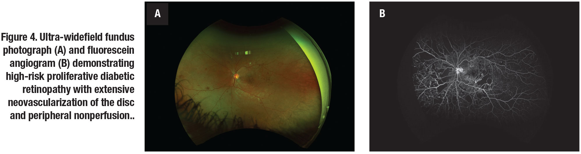 Ultra-widefield angiography has been shown to detect approximately four times more retinal non-perfusion and two times more neovascularization compared to conventional standard seven-field imaging (Figure 3, page 34). Additionally, UWFA detected non-perfusion and neovascularization in 10 percent of eyes that would have otherwise been missed by standard FA (Figure 4,).9