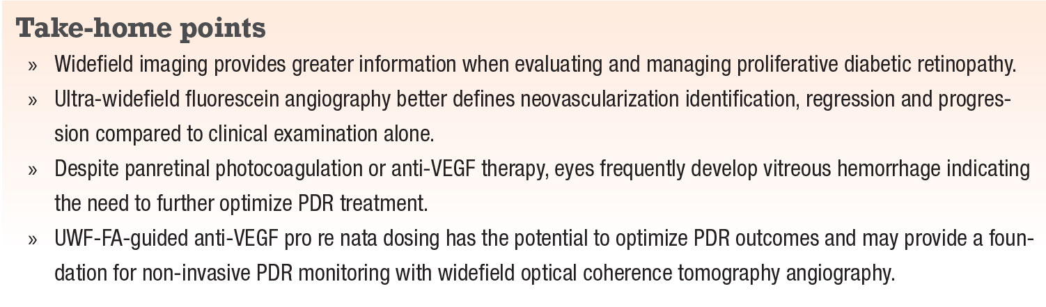 We also hope that our widefield FA-guided findings stimulate further evaluation on monitoring PDR activity with UWF-FA and of various dosing regimens for PDR. DRCR Retina Network Protocol AA results will provide additional important information on widefield imaging in DR. RS