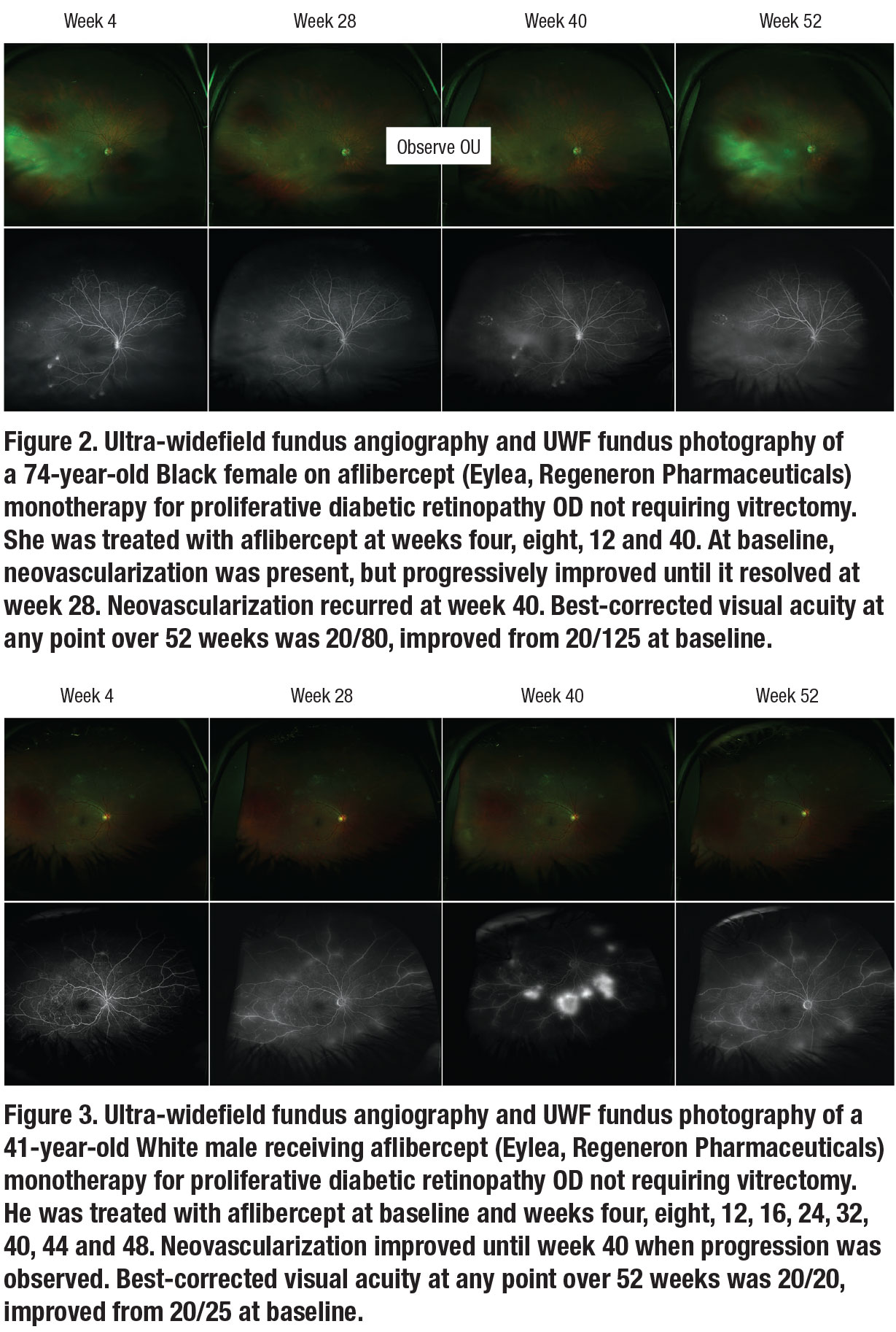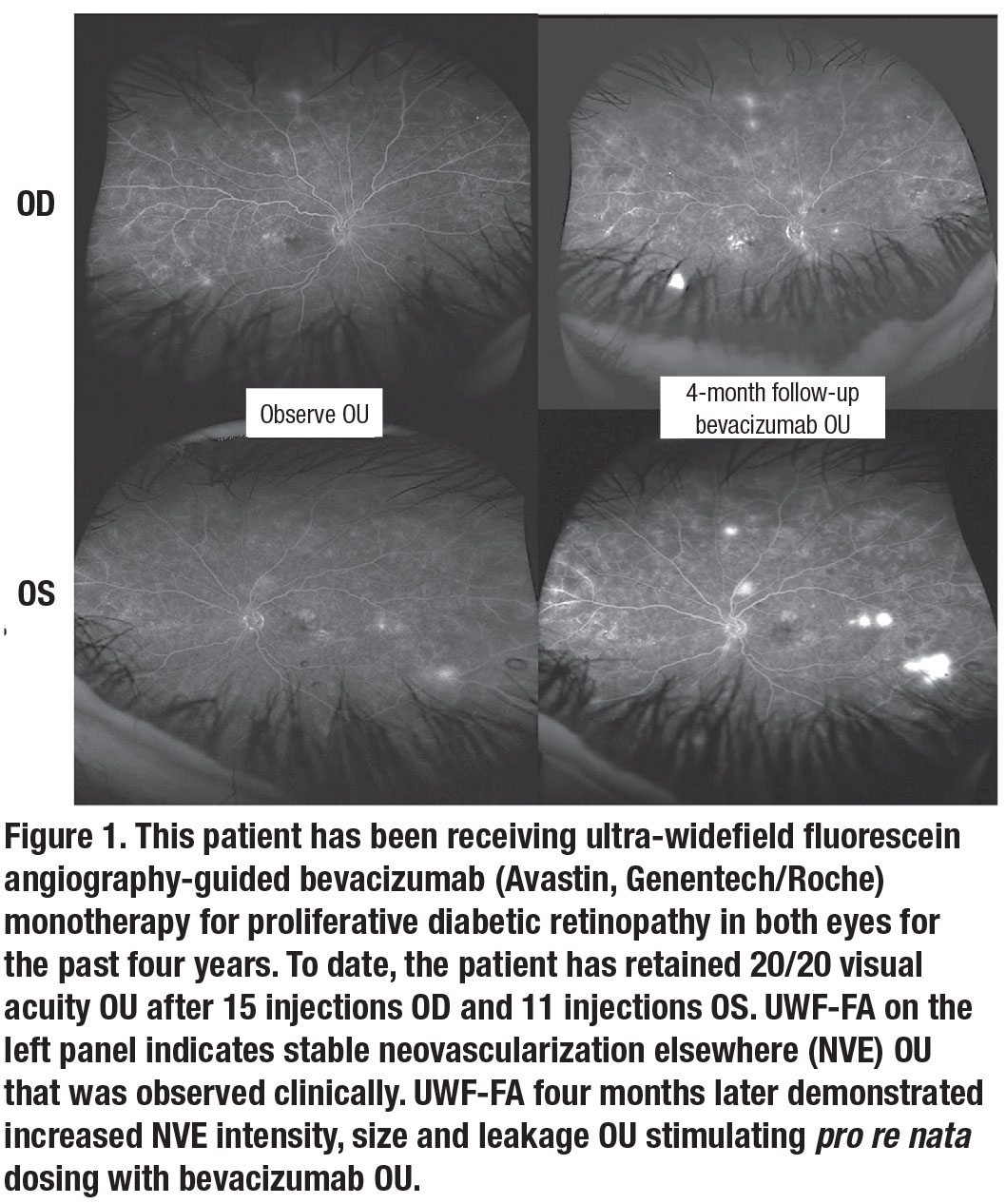 We also evaluated using UWF-FA to guide pro re nata aflibercept monotherapy in 17 PRP-naïve PDR eyes not requiring vitrectomy (Figures 2 and 3). Through one year, we observed excellent safety and a 4-letter VA gain. We also observed an absence of neovascularization on UWF-FA in 41 percent of eyes at four weeks after the first aflibercept injection. Progression after regression of neovascularization occurred as only 24 percent of eyes demonstrated absence of neovascularization at one year despite an average of 5.7 injections administered.38