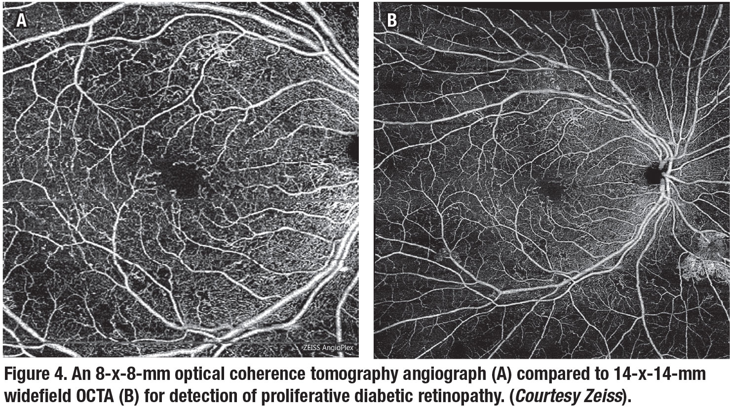 OCTA can also detect diabetic macular ischemia as well as FA.41,42 Recent studies have demonstrated that widefield OCTA may be an appropriate imaging modality for managing PDR, providing information about neovascularization comparable to UWF-FA.43 Figure 4 compares widefield OCTA with standard field OCTA.