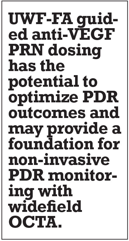 UWF-FA guided anti-VEGF PRN dosing has the potential to optimize PDR outcomes and may provide a foundation for non-invasive PDR monitoring with widefield OCTA, especially as continued use and advancements in wide-angle and widefield montage OCTA emerge.24,26,40-45