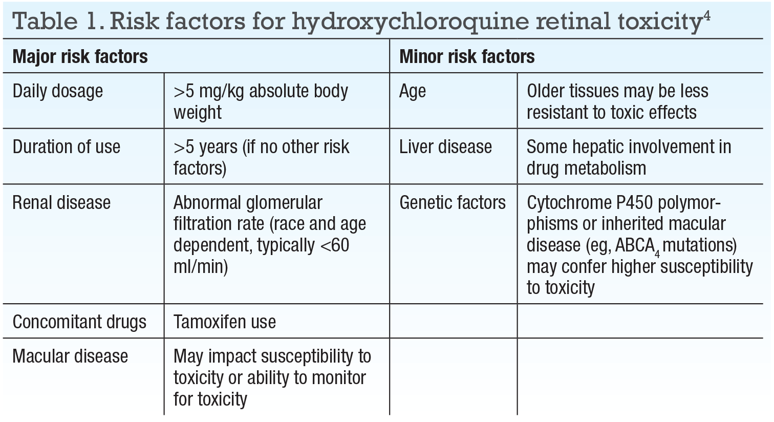 Age, hepatic disease and genetic factors (eg, ABCA4 or cytochrome P450 polymorphisms) are considered “lesser risk factors,” in that biologic plausibility exists but no definitive evidence that they contribute to toxicity.4 Table 1 (page 11) summarizes the risk factors set forth by the American Academy of Ophthalmology in 2016.