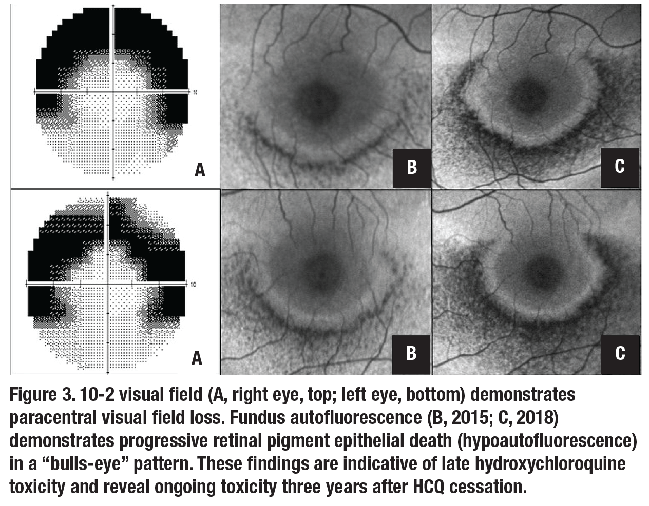 The patient was lost to follow-up for three more years and presented again in 2018 with a chief concern of progressive blurred vision in both eyes. She noted that the azathioprine she was taking didn’t control her lupus as well as HCQ. Visual acuity was 20/30 in both eyes and multimodal imaging demonstrated progressive HCQ toxicity in both eyes (Figure 3C, page 12). Continued HCQ avoidance was recommended, a letter was sent to her rheumatologist and regular ophthalmologic follow-up was again emphasized.