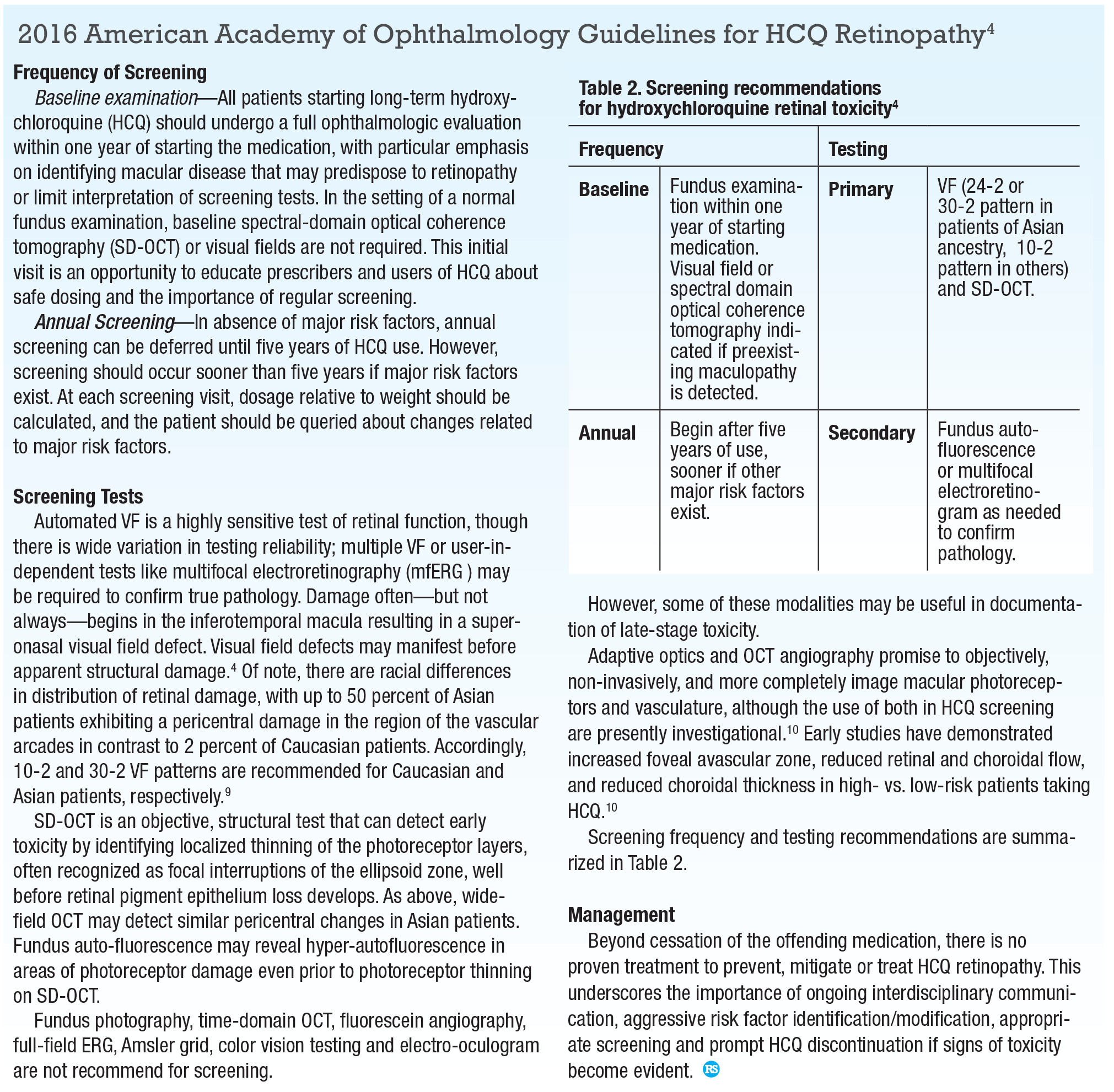 The AAO released its revised guidelines for HCQ retinopathy screening in 2016.4 Prior surveys of ophthalmologists and rheumatologists have revealed incomplete understanding and implementation of AAO guidelines, which could result in HCQ toxicity or inappropriate cessation of a highly beneficial medication.1,6 We summarize the 2016 AAO guidelines (opposite page) for further review. RS