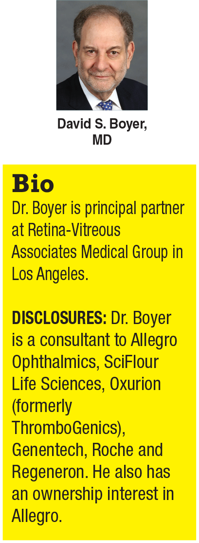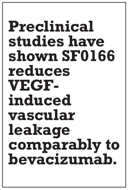 Preclinical studies have shown SF0166 reduces VEGF-induced vascular leakage comparably to bevacizumab.25 Results of a Phase I/II trial in patients with DME have so far shown no corneal toxicity or other drug-related serious adverse events. The study has also found measurable changes in central subfield thickness (CST) after treatment in both the 2.5% and 5% SF0166 treatment groups. At the end of treatment on day 28, 10 of 35 subjects showed decreases in CST, but at the end of the study on day 56, 19 of 38 subjects showed a decrease in CST. This illustrates a trend toward increased anatomic response from day 28 to day 56 of treatment. Of note: The trial has found no overall change in visual acuity and no correlation between CST and BCVA changes.