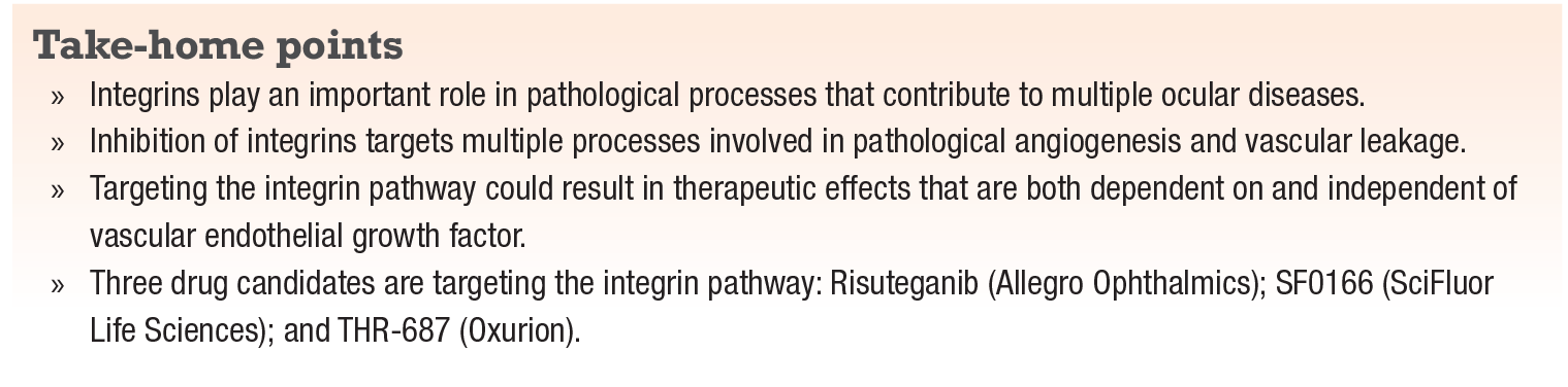 This article describes the role integrins have in angiogenesis, inflammation and neovascularization, and discusses the clinical trials of the three investigational drugs targeting the integrin pathway.