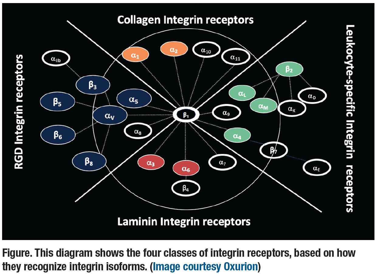 Integrins are transmembrane receptors that are heterodimers, which means they consist of both α and β subunits. They mediate cell-to-cell and cell-to-extracellular interactions, the latter in the retinal matrix.1,2 Integrins modulate cell signaling and are involved in various biological pathways. They’ve been implicated in various eye diseases, including cornea neovascularization; glaucoma and dry eye, along with both dry and wet AMD and diabetic retinopathy.3,4
