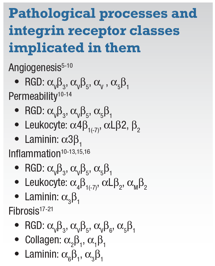 They each play a different role in the four primary pathologic processes: angiogenesis;5-10 permeability;10-14 inflammation;10-13,15,16 and fibrosis17-21 (Table, page 30). Multiple RGD integrin receptors have been implicated in the disease processes of wet AMD and DR. For example, targeting specific subunits of RGD, collagen and integrin receptors would effectively target fibrosis, whereas angiogenesis is a function of specific RGD receptors.
