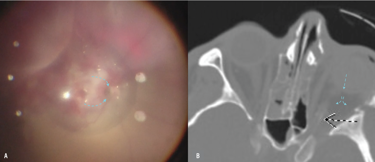 A) Intraoperative imaging depicts the defect located at the temporal edge of the optic nerve and the route of perfluorooctane (PFO) migration. B) Postoperative computerized tomography scan shows the PFO in the orbit (blue arrows) with possible hyperintensity of the distal optic nerve. |