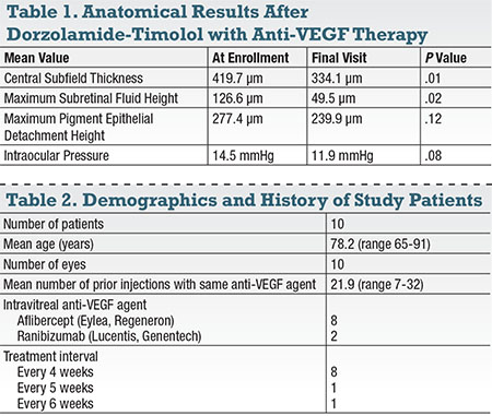 Thus, we hypothesized that decreasing the outflow via a potent aqueous suppressant such as dorzolamide hydrochloride-timolol maleate may effectively reduce the clearance of the intravitreal drug.7 Here, we report on a small study we conducted that aimed to evaluate the effects of adding topical dorzolamide-timolol (Cosopt, Akorn, Lake Forest, Ill.) to a fixed-interval intravitreal anti-VEGF regimen on both the anatomic and functional outcomes in patients with neovascular AMD who had not responded optimally.