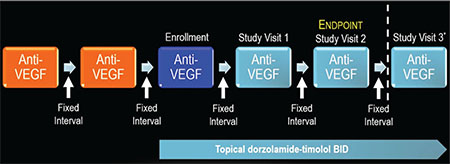 | Figure 1. The study design called for patients to be on the same anti-VEGF drug with the same fixed interval between injections for at least two visits prior to enrollment. Following enrollment (dark blue), patients were maintained on the same anti-VEGF drug with the same interval between injections for the study duration. The only addition was topical dorzolamide-timolol BID. While the endpoint was planned at the second visit, eight of 10 eyes stayed on the drops through a third study visit. |