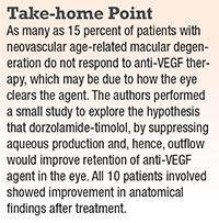 Reports have estimated that 15 percent of patients who suffer from neovascular AMD are classified as non-responders.1,8 A variety of treatment regimens have been tried in these patients in the past. The combination of intravitreal anti-VEGF and topical dorzolamide-timolol is a novel approach that appears to provide some benefit for such patients. We believe that the therapy works by primarily delaying the outflow of the anti-VEGF drug.3,7