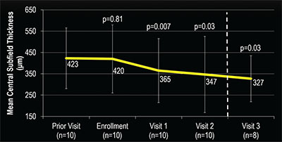 Ten patients (10 study eyes) completed the study protocol and were included for the final analysis. Mean CST decreased from 419.7 μm at enrollment to 334.1 μm at the final visit (P=0.01), with a decrease noted as soon as the first visit after enrollment. All patients were found to have a reduced CST on the final visit after instilling the combination therapy.