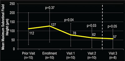 In addition to the decrease in CST (Figure 2), mean maximum SRF height also decreased from 126.6 μm at enrollment to 49.5 μm at the final visit (P=0.02) with the decrease also noted at the first visit after enrollment (Figure 3). Moreover, all study eyes experienced a decrease in maximum SRF height at the final visit. Additionally, four out of the 10 study eyes demonstrated complete resolution of SRF by the final visit.