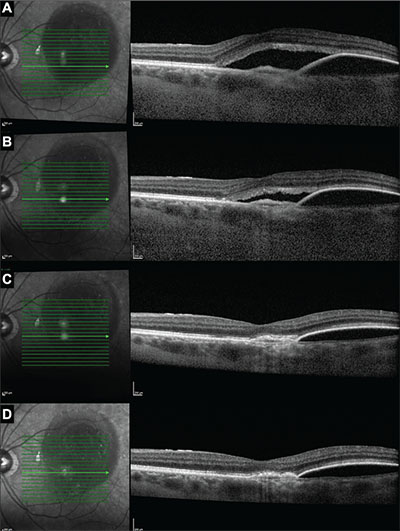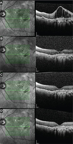 | Figure 5. Optical coherence tomography images in a second subject at enrollment (A), week four (B), week eight (C) and week 12 (D) show rapid improvement in the intraretinal edema after the addition of dorzolamide-timolol to the monthly aflibercept regimen. Prior to enrollment, this patient had received 30 aflibercept injections. |