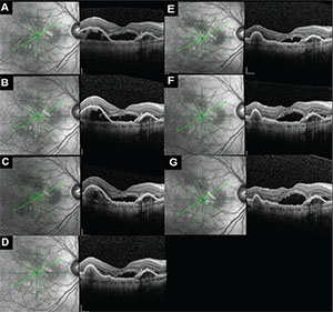| Figure 6. After the addition of dorzolamide-timolol to monthly ranibizumab regimen, optical coherence tomography (OCT) images in another subject at enrollment (A), week four (B), week eight (C), week 12 (D) and week 16 (E) show a gradual decrease in subfoveal subretinal fluid (SRF) as well as pigment epithelial detachment on the left side of the images. Dorzolamide-timolol was discontinued after week 16 and the patient continued to receive monthly intravitreal ranibizumab only. The subsequent OCT images at week 20 (F) and week 24 (G) demonstrate increasing SRF after stopping the drop. Prior to enrollment, this patient had received 30 ranibizumab injections. |