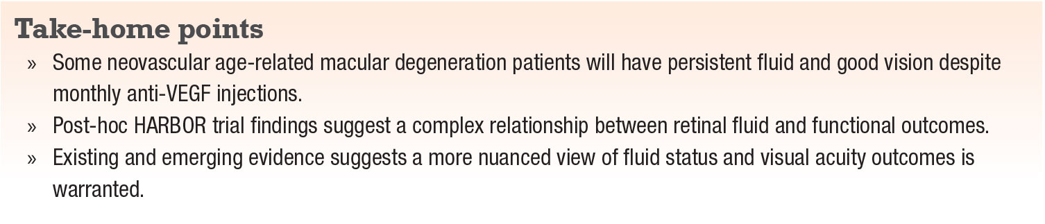 Given this HARBOR analysis and emerging analyses of other large data sets in nAMD, such as the LADDER trial, perhaps a more nuanced view of fluid status and visual acuity outcomes is warranted. RS
