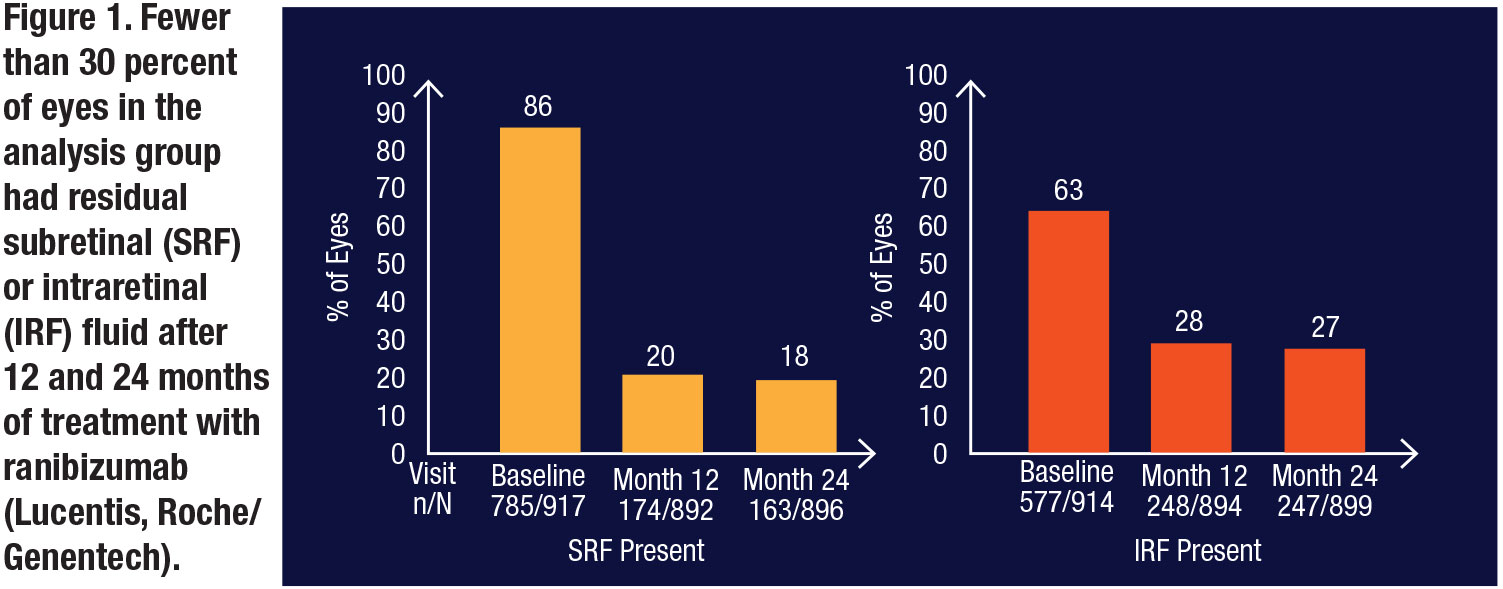 Importantly, fewer than 30 percent of eyes in the analysis population had residual SRF or IRF after 12 and 24 months of ranibizumab injected monthly or prn (Figure 1).