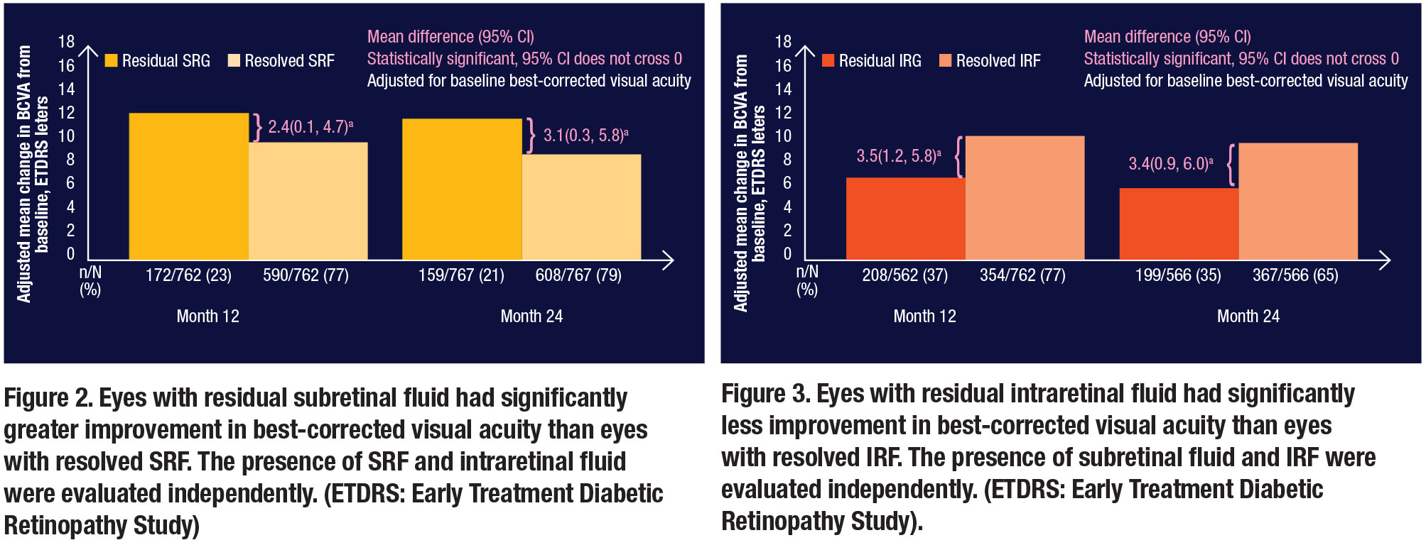 The post-hoc analysis also examined SRF and compared adjusted mean change in BCVA in eyes with residual SRF to eyes with resolved SRF at months 12 and 24 (Figure 2). Eyes with residual SRF had statistically better visual acuity outcomes than eyes with resolved SRF. In short, when looking at SRF, drier was not necessarily better.