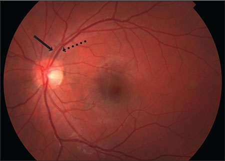 | Narrow retinal arterioles (solid arrow) and wider retinal venules (dashed arrow) are indicators of cardiovascular risk factors such as diabetes, high blood pressure and dyslipidemia. |