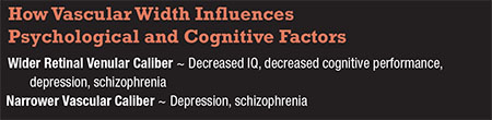 Retinal vascular caliber is also associated with neurocognitive performance among adults. Wider retinal venular caliber is associated with lower IQ and decreased performance on cognitive domains, including verbal comprehension, working memory, processing speed, executive function and motor skills performance.13 Furthermore, poorer retinal vascular structure has been associated with increased risk for dementia.23 Studies have also reported that symptoms and diagnosis of depression, as well as schizophrenia, are associated with narrower retinal arteriolar caliber and wider retinal venular caliber.24-27