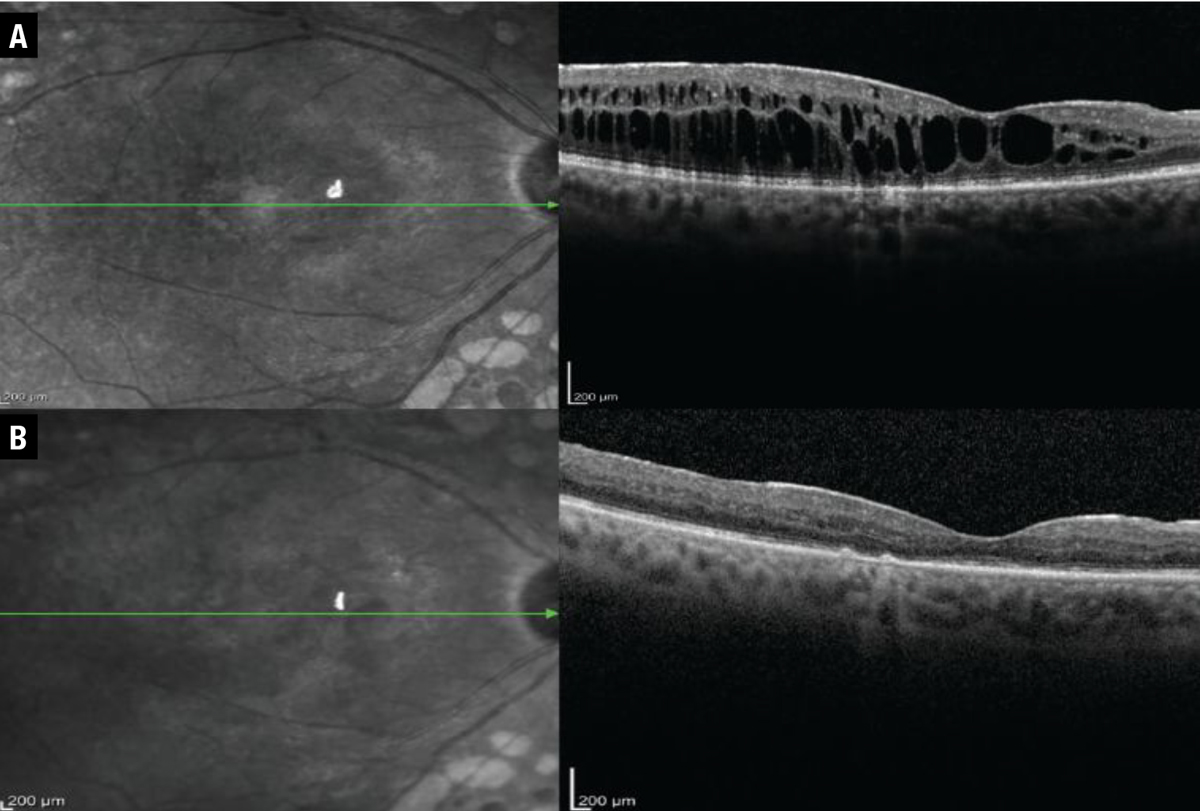 We demonstrate one such case (Figure), which shows serial OCTs of a patient before getting the DEX implant and six weeks afterward. This patient’s central foveal thickness improved from 460 to 210 µm and visual acuity improved from 20/50 to 20/30 Snellen equivalent. This patient was minimally responsive to previous anti-VEGF therapy, but tolerated the DEX implant well and didn’t go on to develop an IOP response.