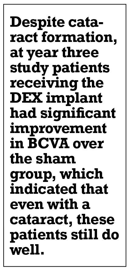 Despite cataract formation, at year three study patients receiving the DEX implant had significant improvement in BCVA over the sham group, which indicated that even with a cataract these patients still do well.