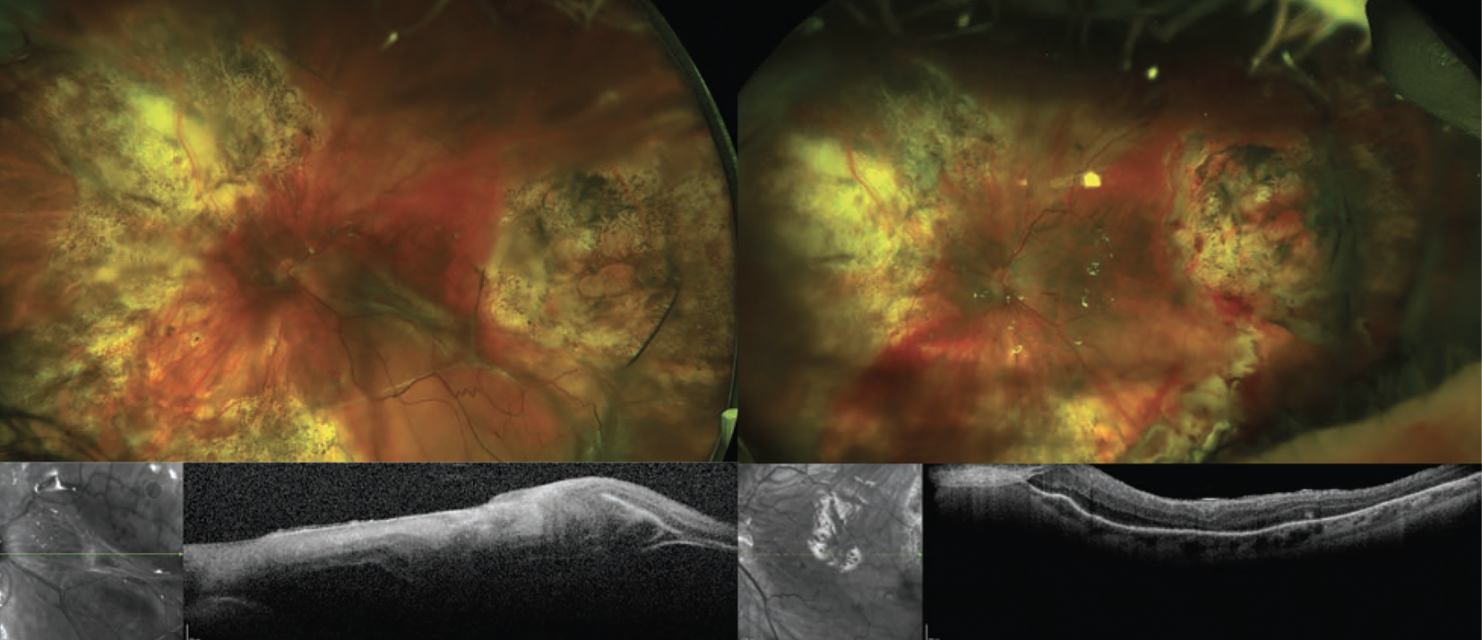 Figure 1. Preoperative view shows temporal retinal detachment with marked peripheral chorioretinal scarring, proliferative vitreoretinopathy, subretinal bands in the macula and a star fold with adjacent retinal break. Corresponding optical coherence tomography shows disorganized retinal laminations with tractional elevation. Figure 2. Postop, the scleral buckle appears to support the area of inferior traction. Previous areas of macular |