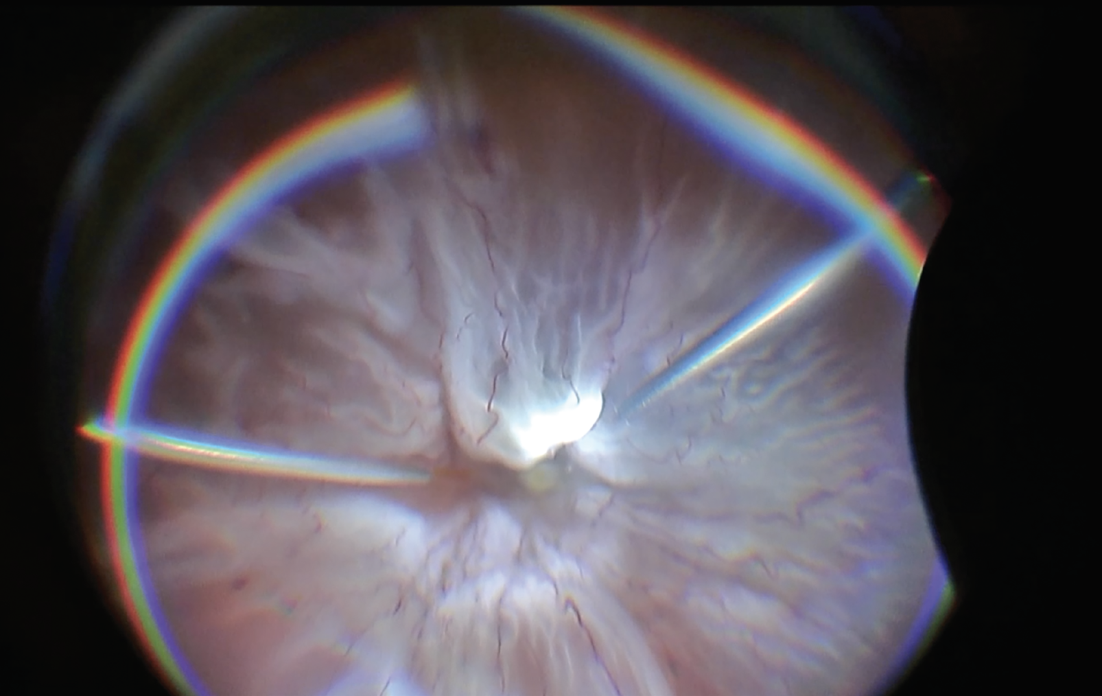 | Figure 3. When dealing with proliferative vitreoretinopathy, Perfluoro-n-octane can stretch out or loosen up the retina. Also, it lets the surgeon judge the possibility to reattach the retina using a direct PFO-to-oil exchange. (John Kitchens, MD) |
