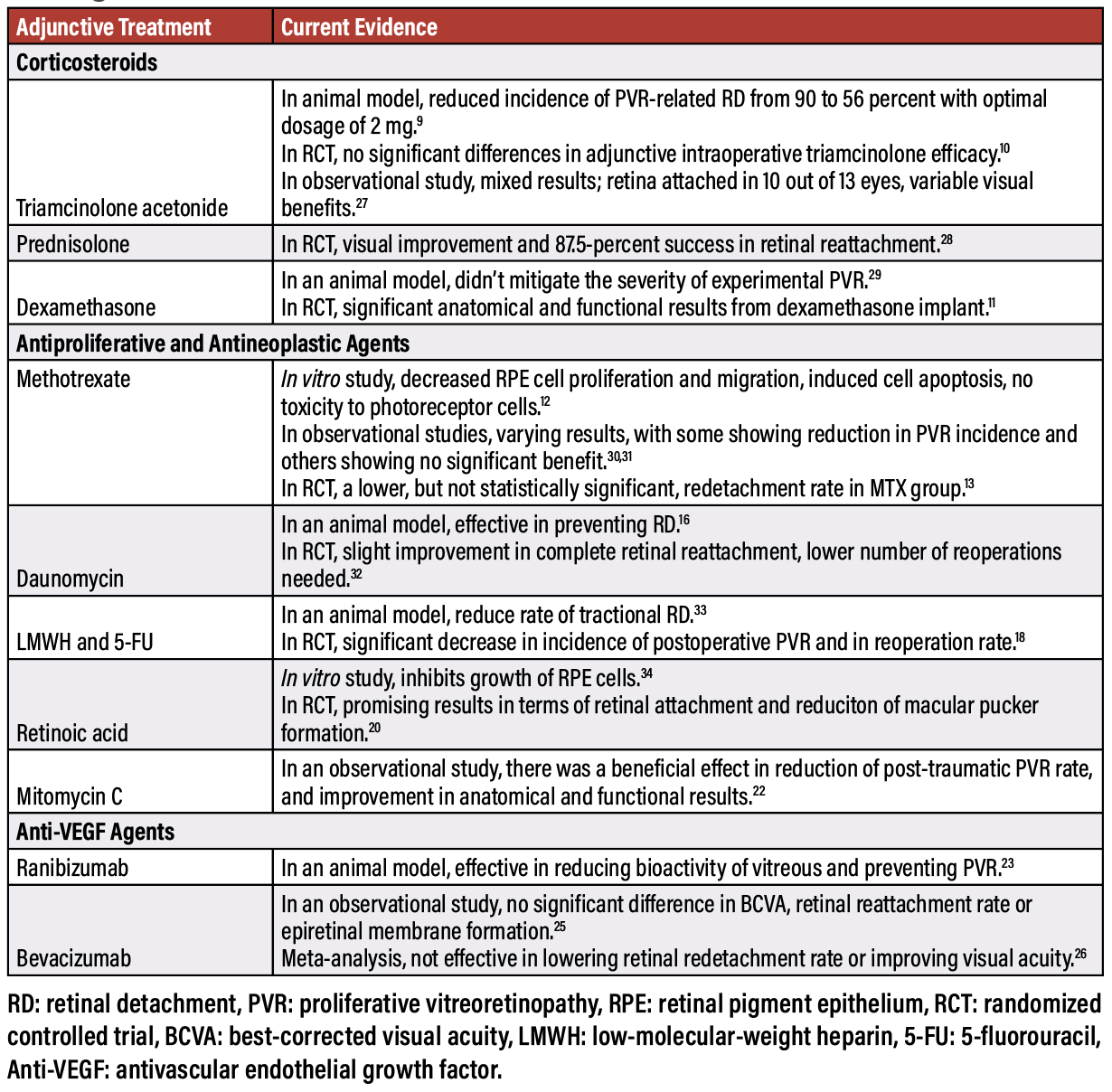 Proliferative vitreoretinopathy continues to be a concern in retinal detachment surgery, presenting significant challenges in achieving optimal surgical outcomes. Despite advancements in surgical methods and a deeper comprehension of PVR’s pathophysiology, postoperative anatomical and visual results remain suboptimal.1 This has prompted the exploration of various adjunctive pharmacological therapies in conjunction with surgical intervention.