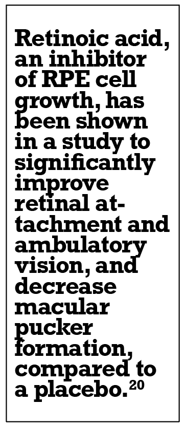 Retinoic acid, an inhibitor of RPE cell growth, has been shown in a study to significantly improve retinal attachment and ambulatory vision, and decrease macular pucker formation, compared to a placebo.20 In addition, mitomycin C and a host of other antiproliferative compounds have displayed promising results in preclinical studies, though their clinical efficacy and safety remain to be confirmed in human trials.21,22 Presently, topotecan is under Phase II clinical investigation for its antifibrotic and antiproliferative effects in PVR-related RD.