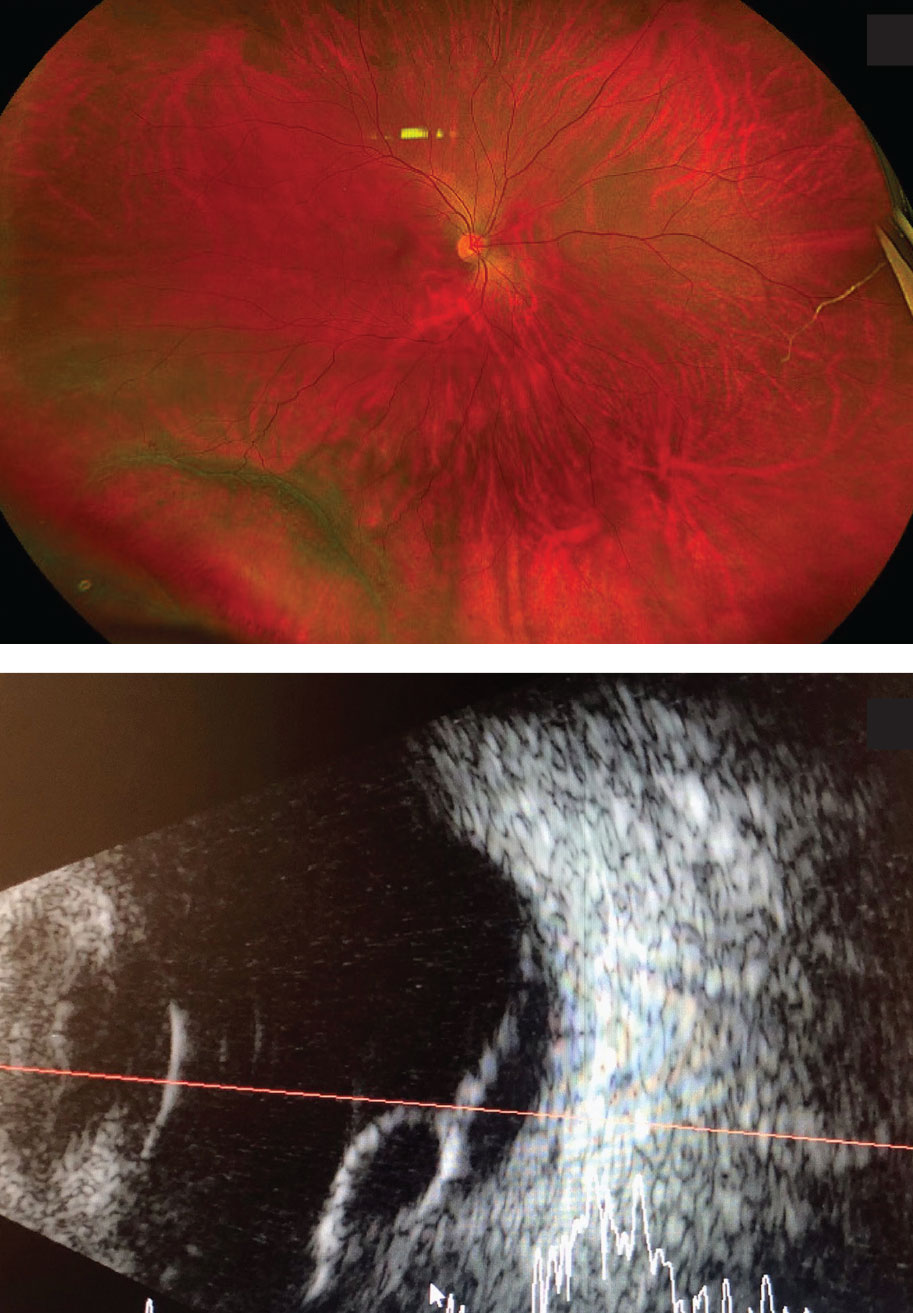 A 29-year-old, myopic, pregnant woman at 36 weeks gestation was referred for evaluation of a macula-on inferotemporal retinal detachment with a retinoschisis component as indicated by ultrasonography (Figure).