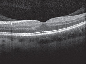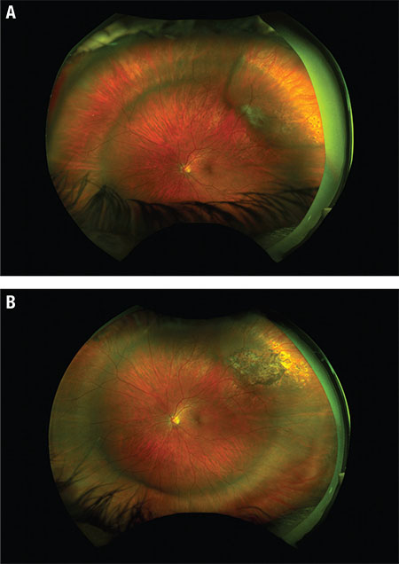 On postoperative day one, the retinal break was well supported and fresh cryotherapy marks could be seen surrounding it. Shallow SRF remained (Figure 3A, page 18). At postoperative month two, the SRF had entirely resolved, and the cryotherapy scars had matured to become pigmented (Figure 3B). At this visit, the patient achieved 20/20 visual acuity with a -2.25 D spherical refraction. The patient’s refractive outcome left her with functional monovision, and she was able to adapt well to a contact lens OS.