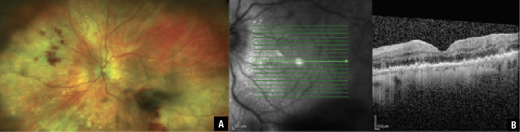| Figure 1. A) Widefield pseudococolor image shows biopsy-proven vitreoretinal lymphoma with vitritis, retinal hemorrhages and multiple areas of varying size circular lesions throughout the periphery. B) Optical coherence tomography highlights the nodular appearance of the retinal pigment epithelium and infiltrates between the RPE and Bruch’s membrane. (Courtesy Johnathan A. Gonzales, MD). |
