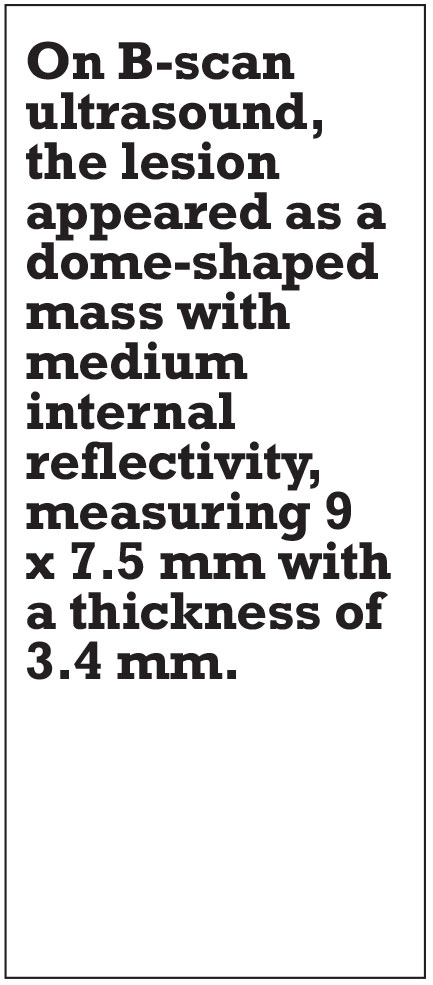 The dilated fundus exam in the left eye was notable for a pigmented choroidal lesion in the superonasal periphery with central lipofuscin and associated subretinal fluid. On B-scan ultrasound, the lesion appeared as a dome-shaped mass with medium internal reflectivity, measuring 9 x 7.5 mm with a thickness of 3.4 mm.