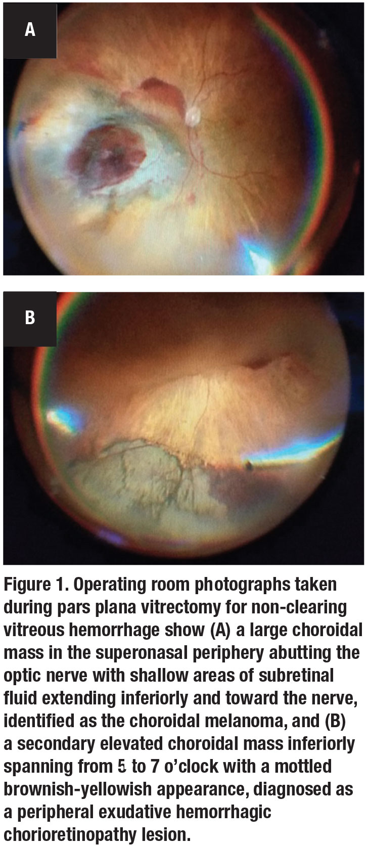 The patient was taken to the operating room for pars plana vitrectomy. A large mass of dehemoglobinized vitreous hemorrhage was present in the central vitreous, which was cleared and shaved into the periphery for 360 degrees. The choroidal melanoma was identified as a large choroidal mass in the superonasal periphery abutting the optic nerve with shallow areas of subretinal fluid extending inferiorly and toward the nerve (Figure 1A).