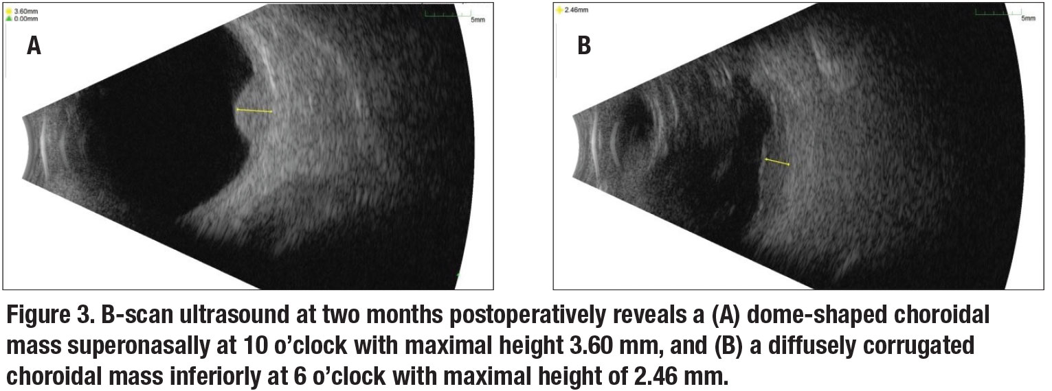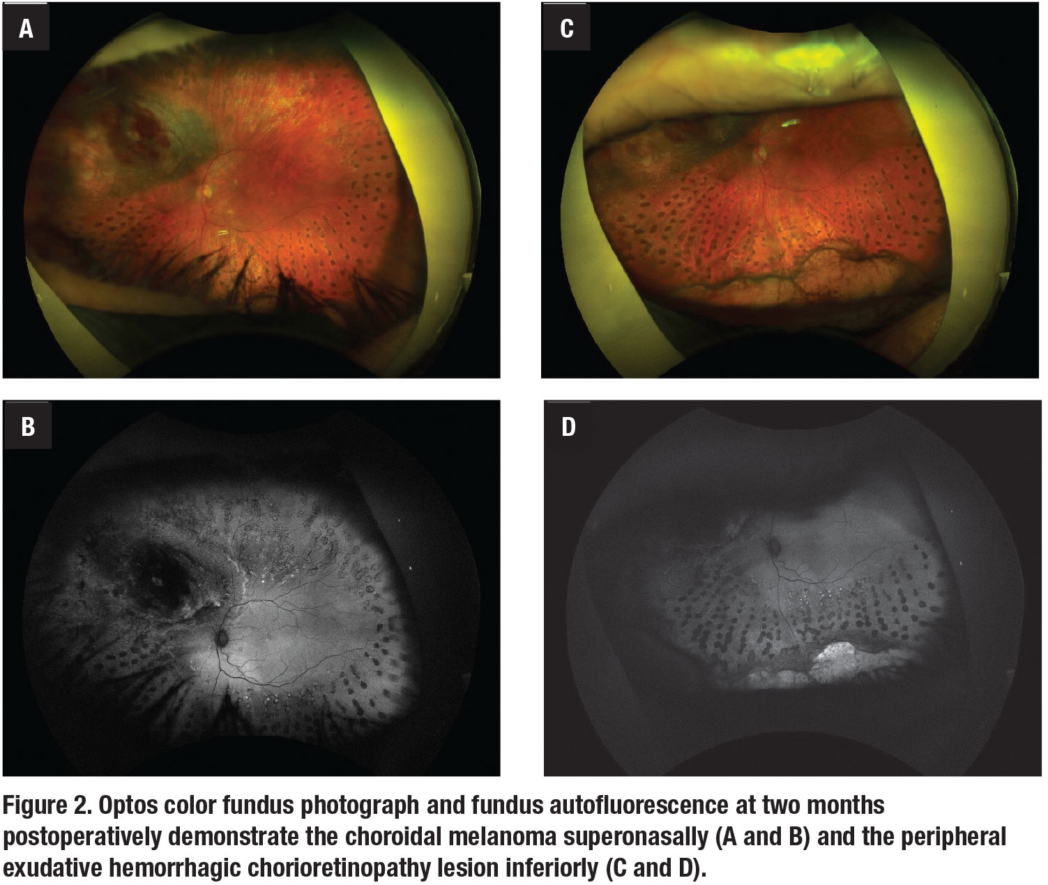 Unexpectedly, we noted a second elevated choroidal mass inferiorly, spanning from 5 to 7 o’clock with a mottled brownish-yellowish appearance (Figure 1B). This was clinically diagnosed as peripheral exudative hemorrhagic chorioretinopathy (PEHCR). We applied a 360-degree endolaser peripheral panretinal photocoagulation to treat presumed radiation retinopathy, sparing the surfaces of the two mass lesions. At the conclusion of the case, we injected a 0.05 mL of intravitreal bevacizumab (Avastin, Genentech/Roche) to treat the presumed active choroidal neovascular membrane.