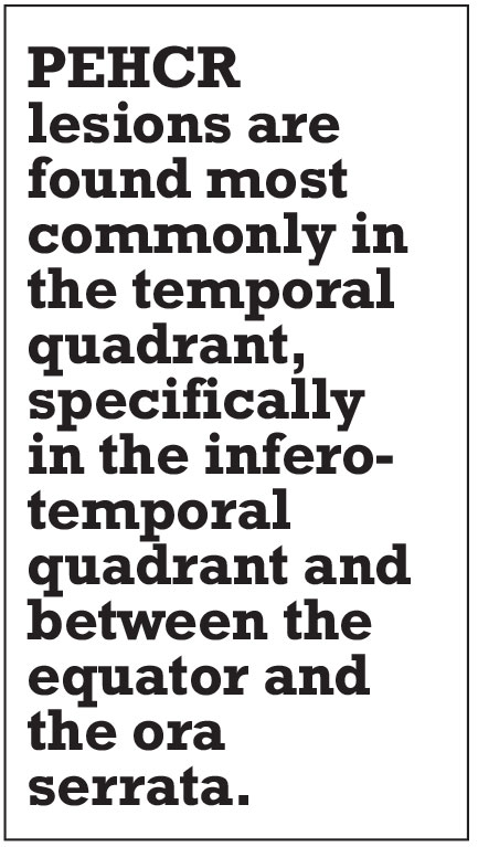 PEHCR lesions are found most commonly in the temporal quadrant, specifically in the inferotemporal quadrant and between the equator and the ora serrata.2,4,5 This is in contrast to choroidal melanomas, which are most commonly located at the macula or between the macula and the equator.6