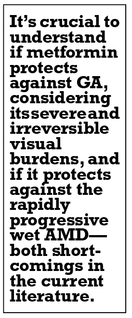 It’s crucial to understand if metformin protects against GA, considering its severe and irreversible visual burdens, and if metformin protects against the rapidly progressive wet AMD—both shortcomings in the current literature. An ongoing phase II clinical trial of metformin in nondiabetes patients with GA will shed light on its ability to prevent progression of this debilitating and advanced form of AMD.20