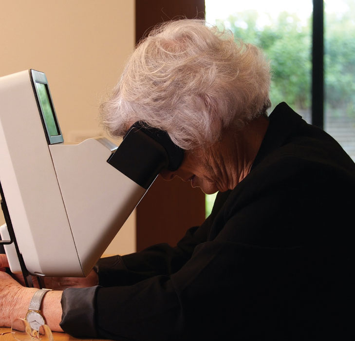 Figure 2. A patient self-images with the Home OCT (Notal Vision) investigational home-based optical coherence tomography device. |