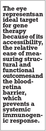 The eye represents an ideal target for gene therapy because of its accessibility, the relative ease of measuring structural and functional outcomes and the blood-retina barrier, which prevents a systemic immunogenic response. Gene therapies may provide an avenue for continuous anti-VEGF therapy with only one treatment.