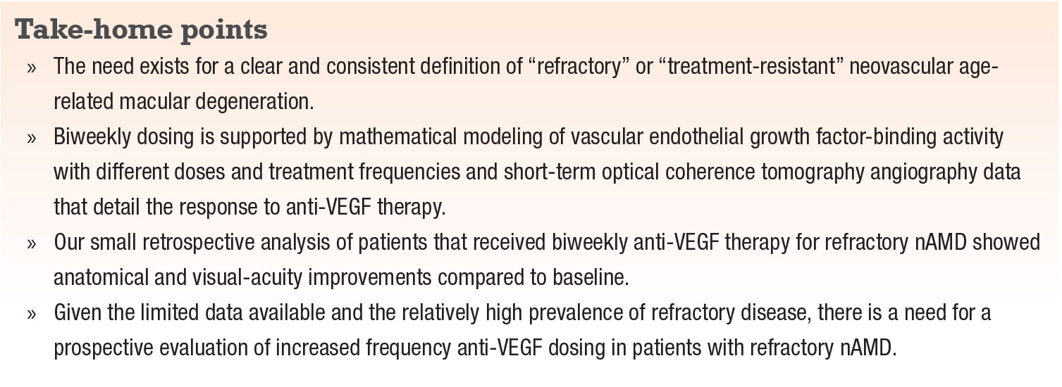The data from our study, as well as that presented by Dr. Witkin and colleagues and the Israeli researchers, suggest improved anatomic and possibly visual outcomes with increased dosing frequency in patients with refractory nAMD.