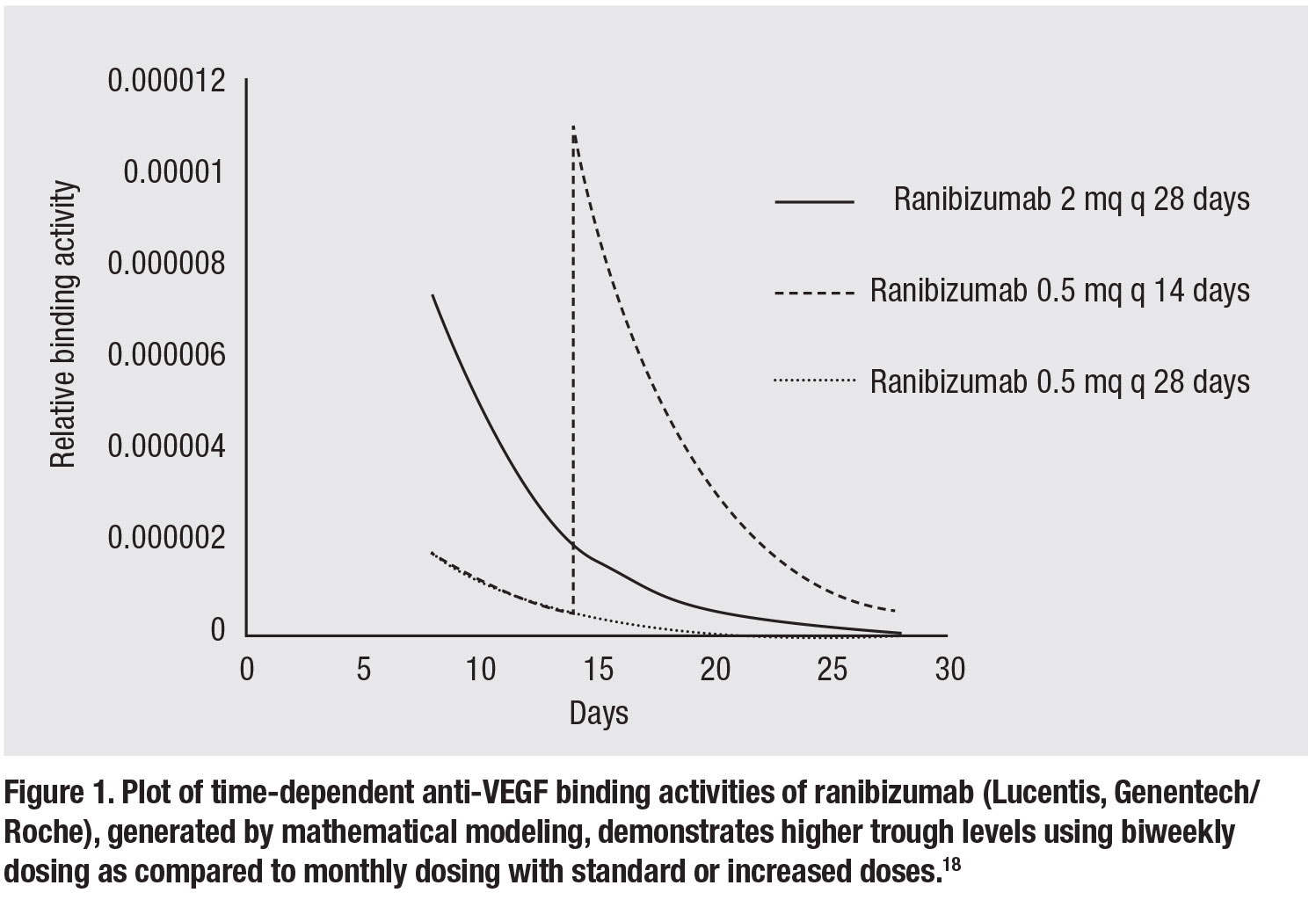 anti-VEGF agents, however, increased dosing frequency (q2 weeks) provides much greater trough levels of drug compared to an increased dose (Figure 1, page 27).18 Given the vast excess of anti-VEGF binding activity at peak levels (e.g., immediately following injection), trough-binding activity likely dictates efficacy.