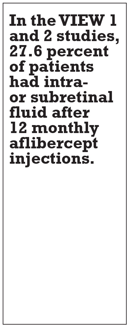 Using this latter definition, the size of the refractory nAMD problem comes into view. One-year CATT data demonstrated persistent fluid on OCT despite 12 monthly treatments in 53.2 percent of ranibizumab-treated and 70.9 percent of bevacizumab-treated patients (Lucentis and Avastin, Genentech/Roche). In the VIEW 1 and 2 studies, 27.6 percent of patients had intra- or subretinal fluid (IRF, SRF) after 12 monthly aflibercept injections (Eylea, Regeneron Pharmaceuticals).7,8 Given the prevalence of this problem, an assessment of treatment options for this challenging population appears warranted.