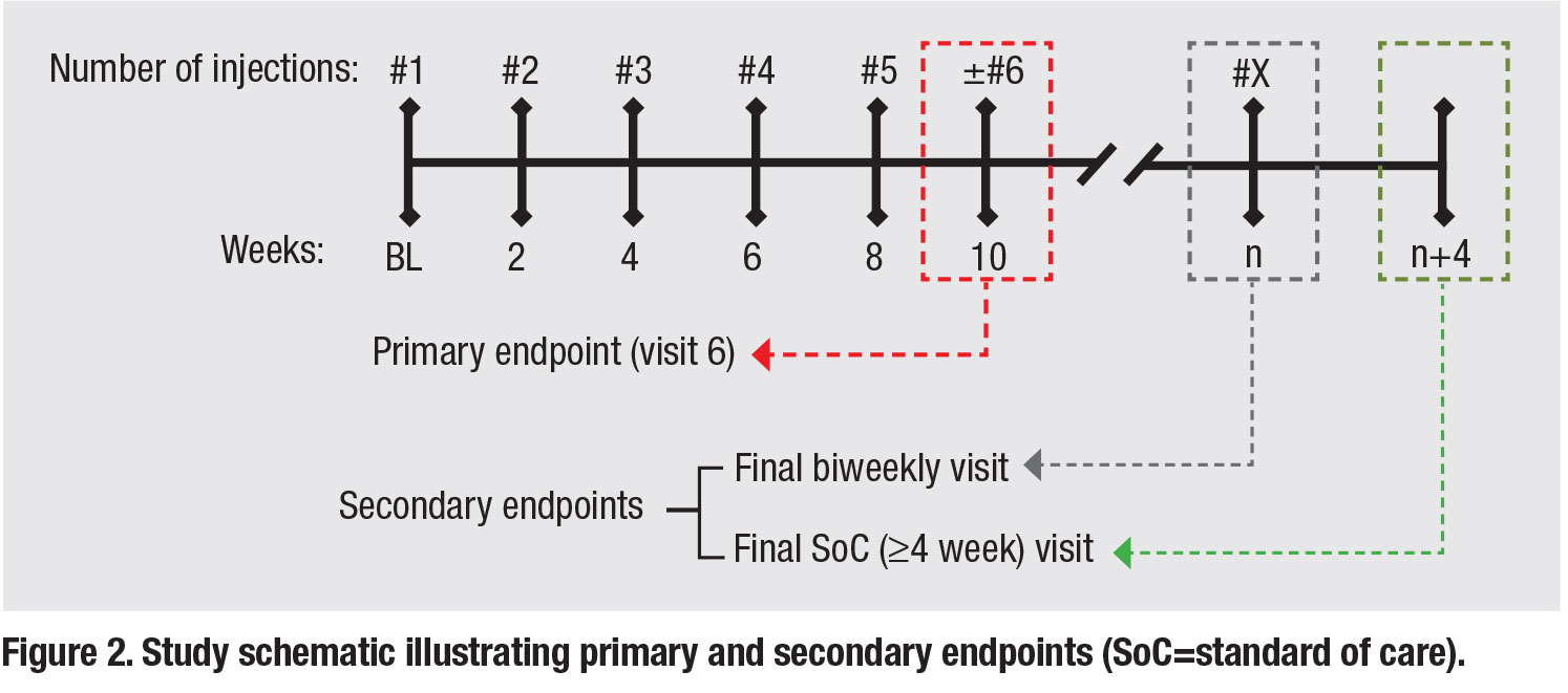 In terms of biweekly treatment, patients underwent a mean of 18.1 biweekly injections at a mean treatment interval of 16.5 days. Figure 3 (page 28) shows the various