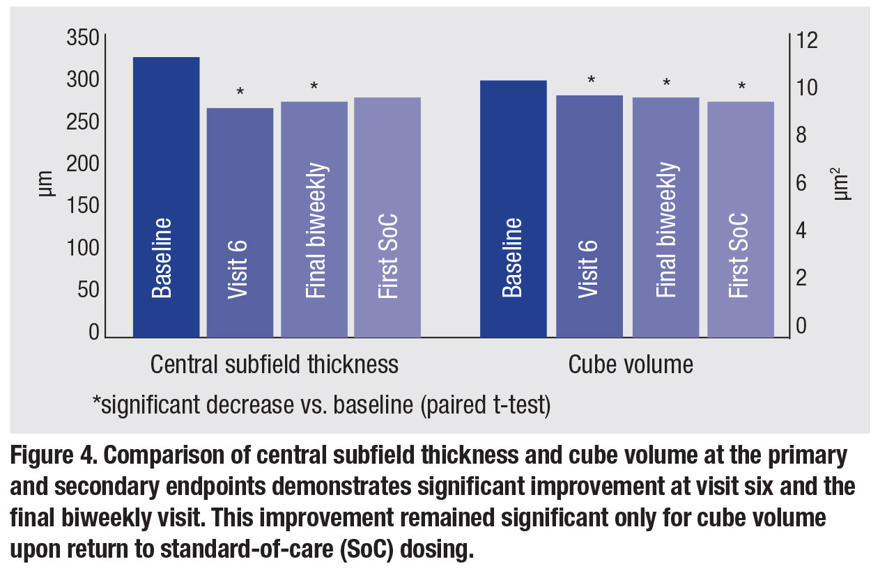 No safety signals were noted during biweekly therapy. From an anatomic standpoint, a significant decrease in central subfield thickness and cube volume was noted at visit six. Both measures remained significantly improved through the final biweekly visit, but only cube volume remained significantly improved upon return to SOC dosing (Figure 4).