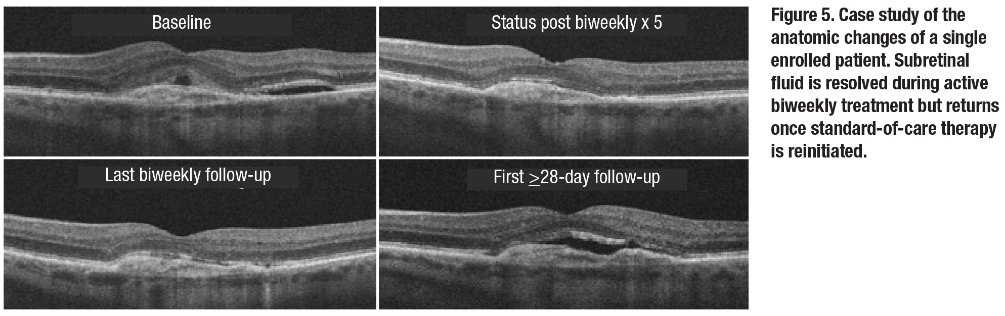 Analysis of qualitative fluid status revealed biweekly therapy was more effective at eliminating SRF than IRF. Nearly one-third of patients had complete SRF resolution at visit six, while none achieved completed IRF resolution. This effect on SRF waned upon return to SOC dosing. Figure 5 demonstrates the anatomical response of a single included patient to biweekly therapy and highlights the return of SRF upon return to SoC dosing.